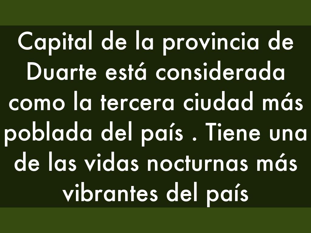 Capital de la provincia de Duarte está considerada como la tercera ciudad más poblada del país . Tiene una de las vidas nocturnas más vibrantes del país