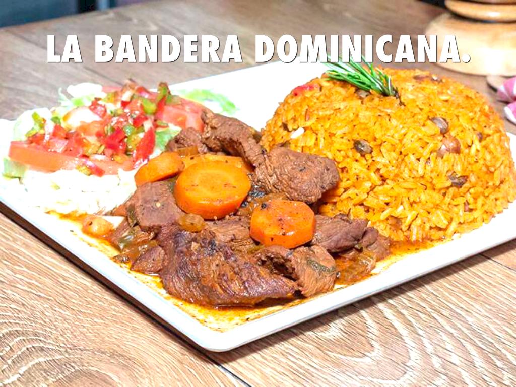 - Compuesta por arroz blanco , habichuelas guisadas ,ensalada verde , pollo guisado Dominicano ,res o cerdo y los tostones .
