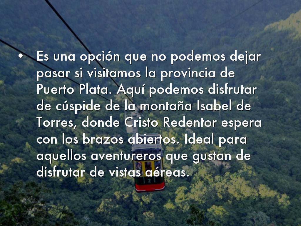 - Es una opción que no podemos dejar pasar si visitamos la provincia de Puerto Plata. Aquí podemos disfrutar de cúspide de la montaña Isabel de Torres, donde Cristo Redentor espera con los brazos abiertos. Ideal para aquellos aventureros que gustan de disfrutar de vistas aéreas.