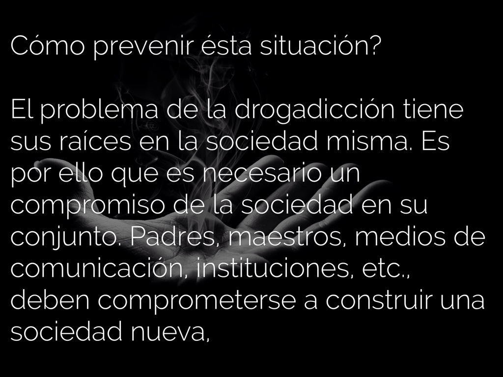 El problema de la drogadicción tiene sus raíces en la sociedad misma. Es por ello que es necesario un compromiso de la sociedad en su conjunto. Padres, maestros, medios de comunicación, instituciones, etc., deben comprometerse a construir una sociedad nueva,