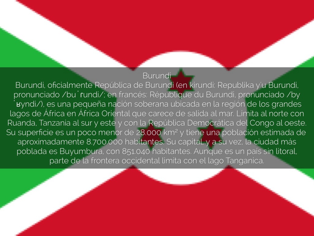 Burundi, oficialmente República de Burundi (en kirundi: Republika y'u Burundi, pronunciado /buˈɾundi/; en francés: République du Burundi, pronunciado /byˈʁyndi/), es una pequeña nación soberana ubicada en la región de los grandes lagos de África en África Oriental que carece de salida al mar. Limita al norte con Ruanda, Tanzania al sur y este y con la República Democrática del Congo al oeste. Su superficie es un poco menor de 28.000 km² y tiene una población estimada de aproximadamente 8.700.000 habitantes. Su capital, y a su vez, la ciudad más poblada es Buyumbura, con 851.040 habitantes. Aunque es un país sin litoral, parte de la frontera occidental limita con el lago Tanganica.