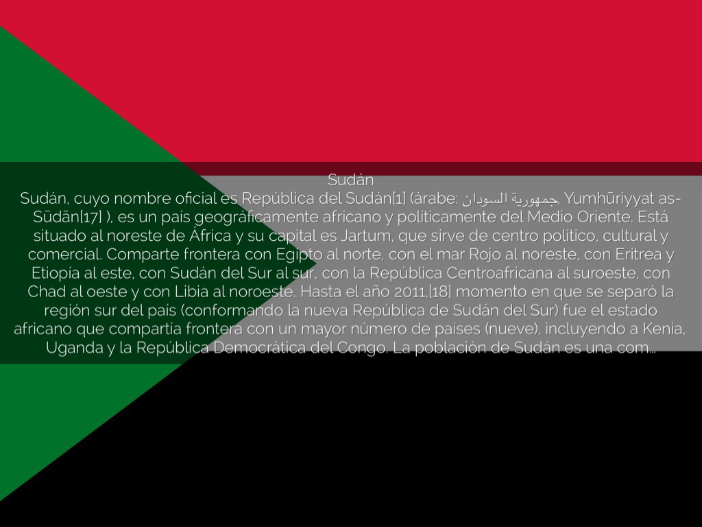 Sudán, cuyo nombre oficial es República del Sudán[1] (árabe: جمهورية السودان, Yumhūriyyat as-Sūdān[17] ), es un país geográficamente africano y políticamente del Medio Oriente. Está situado al noreste de África y su capital es Jartum, que sirve de centro político, cultural y comercial. Comparte frontera con Egipto al norte, con el mar Rojo al noreste, con Eritrea y Etiopía al este, con Sudán del Sur al sur, con la República Centroafricana al suroeste, con Chad al oeste y con Libia al noroeste. Hasta el año 2011,[18] momento en que se separó la región sur del país (conformando la nueva República de Sudán del Sur) fue el estado africano que compartía frontera con un mayor número de países (nueve), incluyendo a Kenia, Uganda y la República Democrática del Congo. La población de Sudán es una comb…