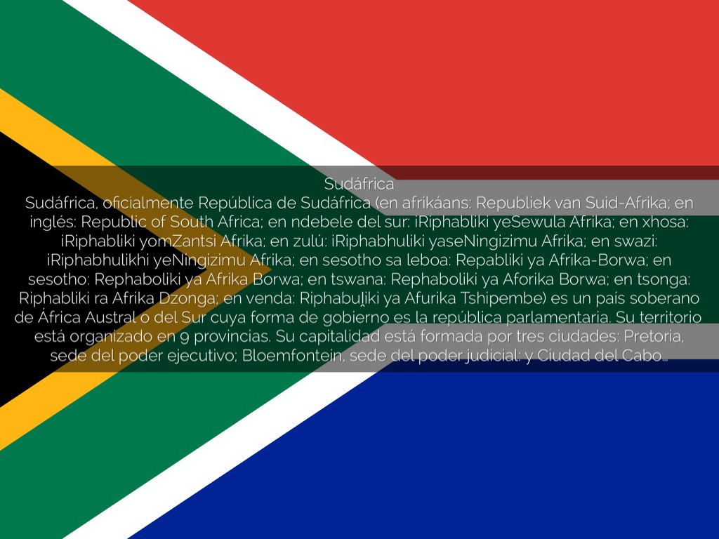 Sudáfrica, oficialmente República de Sudáfrica (en afrikáans: Republiek van Suid-Afrika; en inglés: Republic of South Africa; en ndebele del sur: iRiphabliki yeSewula Afrika; en xhosa: iRiphabliki yomZantsi Afrika; en zulú: iRiphabhuliki yaseNingizimu Afrika; en swazi: iRiphabhulikhi yeNingizimu Afrika; en sesotho sa leboa: Repabliki ya Afrika-Borwa; en sesotho: Rephaboliki ya Afrika Borwa; en tswana: Rephaboliki ya Aforika Borwa; en tsonga: Riphabliki ra Afrika Dzonga; en venda: Riphabuḽiki ya Afurika Tshipembe) es un país soberano de África Austral o del Sur cuya forma de gobierno es la república parlamentaria. Su territorio está organizado en 9 provincias. Su capitalidad está formada por tres ciudades: Pretoria, sede del poder ejecutivo; Bloemfontein, sede del poder judicial: y Ciudad del Cabo, sede del poder legislativo