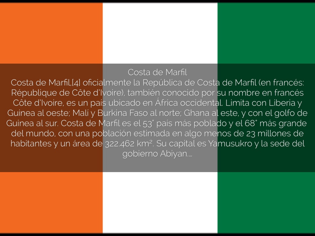 Costa de Marfil,[4] oficialmente la República de Costa de Marfil (en francés: République de Côte d’Ivoire), también conocido por su nombre en francés Côte d’Ivoire, es un país ubicado en África occidental. Limita con Liberia y Guinea al oeste; Malí y Burkina Faso al norte; Ghana al este, y con el golfo de Guinea al sur. Costa de Marfil es el 53° país más poblado y el 68° más grande del mundo, con una población estimada en algo menos de 23 millones de habitantes y un área de 322.462 km². Su capital es Yamusukro y la sede del gobierno Abiyan.