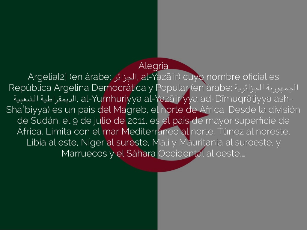 Argelia[2] (en árabe: الجزائر, al-Yazā’ir) cuyo nombre oficial es República Argelina Democrática y Popular (en árabe: الجمهورية الجزائرية الديمقراطية الشعبية, al-Yumhuriyya al-Yazā'iriyya ad-Dīmuqrāţiyya ash-Shaʿbiyya) es un país del Magreb, el norte de África. Desde la división de Sudán, el 9 de julio de 2011, es el país de mayor superficie de África. Limita con el mar Mediterráneo al norte, Túnez al noreste, Libia al este, Níger al sureste, Malí y Mauritania al suroeste, y Marruecos y el Sáhara Occidental al oeste.