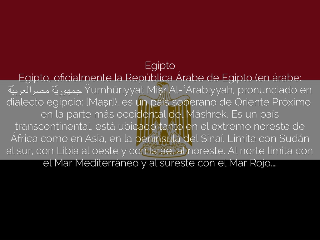 Egipto, oficialmente la República Árabe de Egipto (en árabe: جمهوريّة مصرالعربيّة Ŷumhūriyyat Miṣr Al-ʿArabiyyah, pronunciado en dialecto egipcio: [Maṣr]), es un país soberano de Oriente Próximo en la parte más occidental del Máshrek. Es un país transcontinental, está ubicado tanto en el extremo noreste de África como en Asia, en la península del Sinaí. Limita con Sudán al sur, con Libia al oeste y con Israel al noreste. Al norte limita con el Mar Mediterráneo y al sureste con el Mar Rojo.