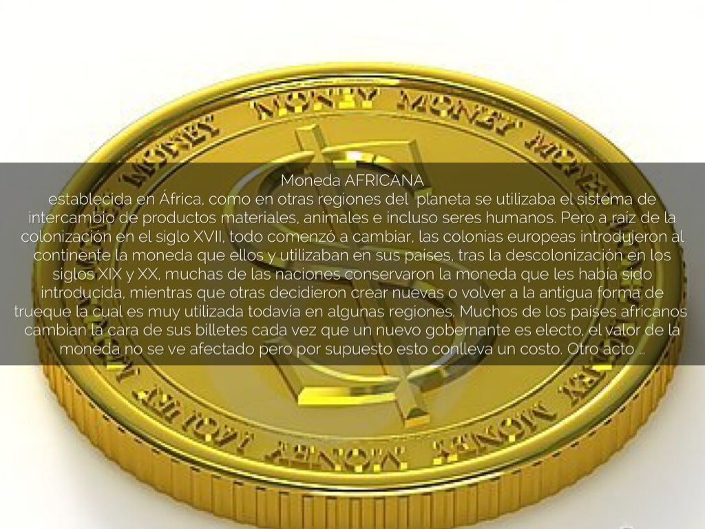 establecida en África, como en otras regiones del planeta se utilizaba el sistema de intercambio de productos materiales, animales e incluso seres humanos. Pero a raíz de la colonización en el siglo XVII, todo comenzó a cambiar, las colonias europeas introdujeron al continente la moneda que ellos y utilizaban en sus países, tras la descolonización en los siglos XIX y XX, muchas de las naciones conservaron la moneda que les había sido introducida, mientras que otras decidieron crear nuevas o volver a la antigua forma de trueque la cual es muy utilizada todavía en algunas regiones. Muchos de los países africanos cambian la cara de sus billetes cada vez que un nuevo gobernante es electo, el valor de la moneda no se ve afectado pero por supuesto esto conlleva un costo. Otro acto muy común es el cambio de divisas ilegal, el cual da lugar en las calles de las grandes ciudades, muchas veces el cambiador se lleva una gran comisión y el cambio se dará en una tasa mucho mejor a las que ofrecen los bancos.