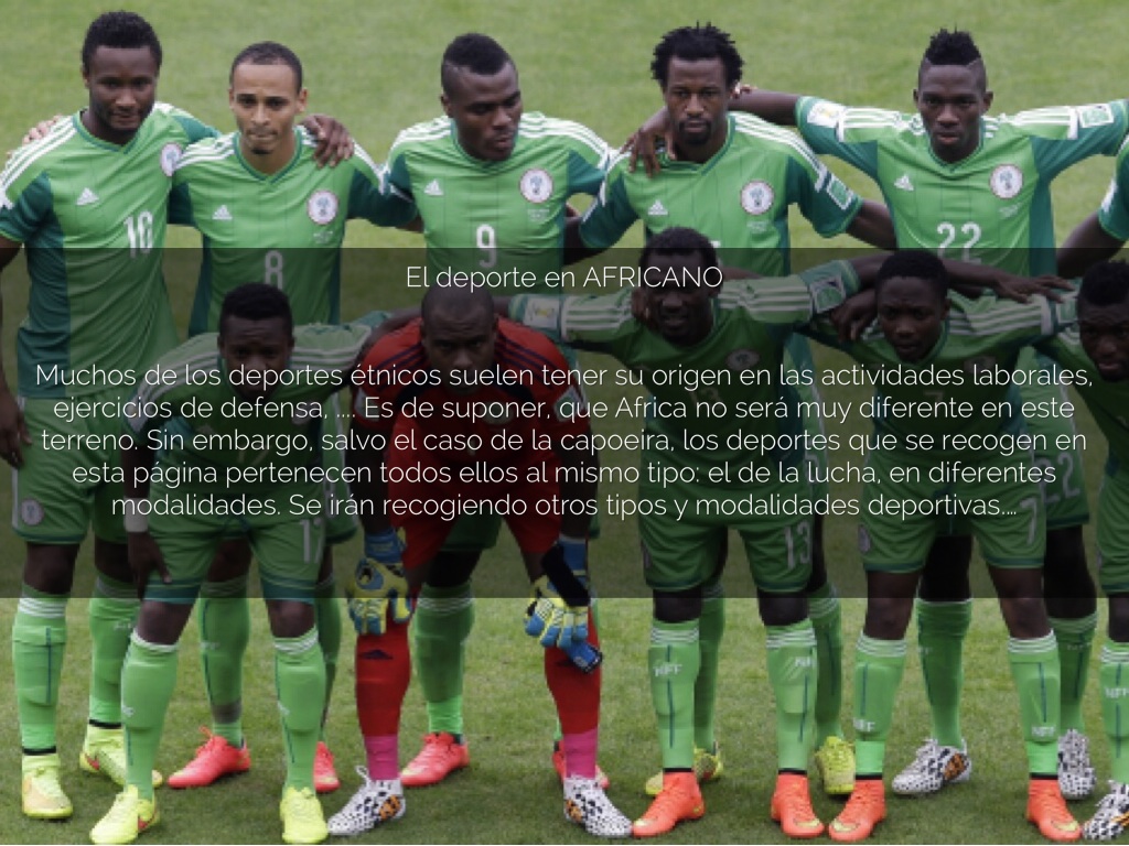 Muchos de los deportes étnicos suelen tener su origen en las actividades laborales, ejercicios de defensa, .... Es de suponer, que Africa no será muy diferente en este terreno. Sin embargo, salvo el caso de la capoeira, los deportes que se recogen en esta página pertenecen todos ellos al mismo tipo: el de la lucha, en diferentes modalidades. Se irán recogiendo otros tipos y modalidades deportivas.