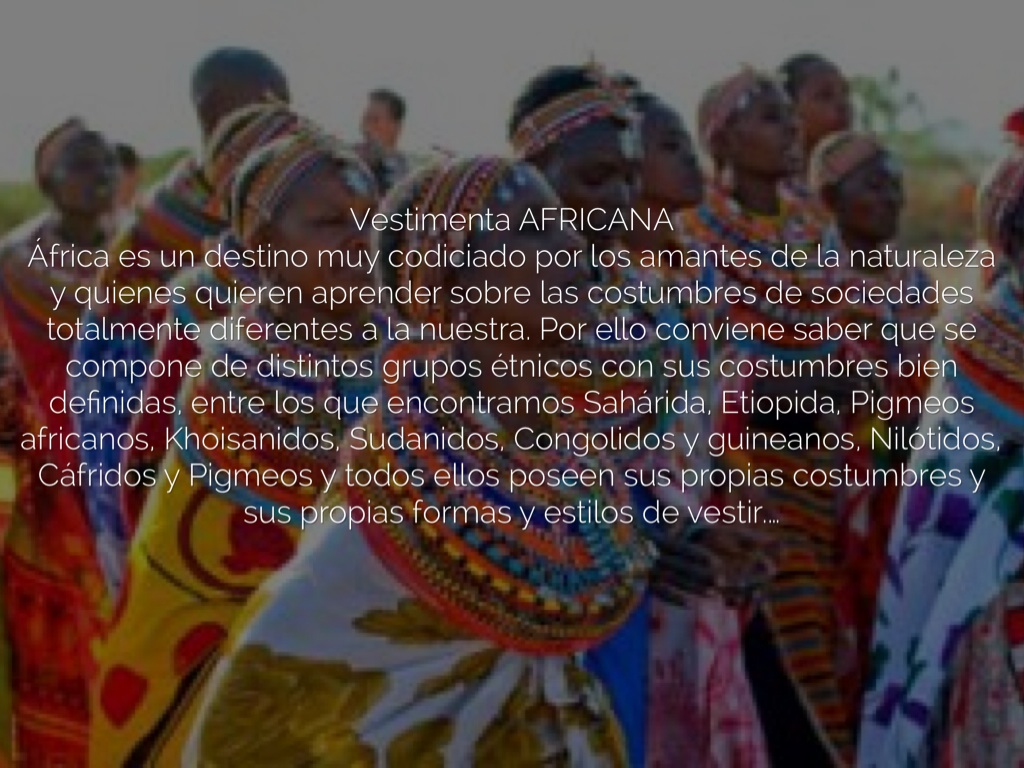 África es un destino muy codiciado por los amantes de la naturaleza y quienes quieren aprender sobre las costumbres de sociedades totalmente diferentes a la nuestra. Por ello conviene saber que se compone de distintos grupos étnicos con sus costumbres bien definidas, entre los que encontramos Sahárida, Etiopida, Pigmeos africanos, Khoisanidos, Sudanidos, Congolidos y guineanos, Nilótidos, Cáfridos y Pigmeos y todos ellos poseen sus propias costumbres y sus propias formas y estilos de vestir.