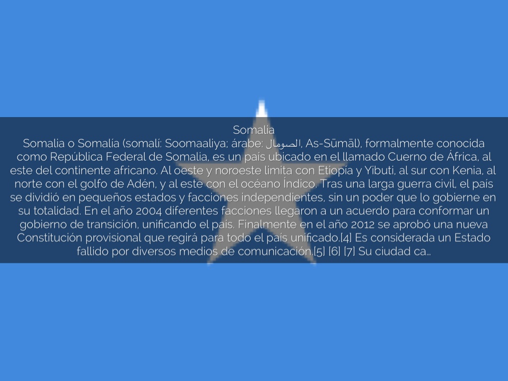 Somalia o Somalía (somalí: Soomaaliya; árabe: الصومال, As-Sūmāl), formalmente conocida como República Federal de Somalia, es un país ubicado en el llamado Cuerno de África, al este del continente africano. Al oeste y noroeste limita con Etiopía y Yibuti, al sur con Kenia, al norte con el golfo de Adén, y al este con el océano Índico. Tras una larga guerra civil, el país se dividió en pequeños estados y facciones independientes, sin un poder que lo gobierne en su totalidad. En el año 2004 diferentes facciones llegaron a un acuerdo para conformar un gobierno de transición, unificando el país. Finalmente en el año 2012 se aprobó una nueva Constitución provisional que regirá para todo el país unificado.[4] Es considerada un Estado fallido por diversos medios de comunicación.[5] [6] [7] Su ciudad capital y más poblada es Mogadiscio.