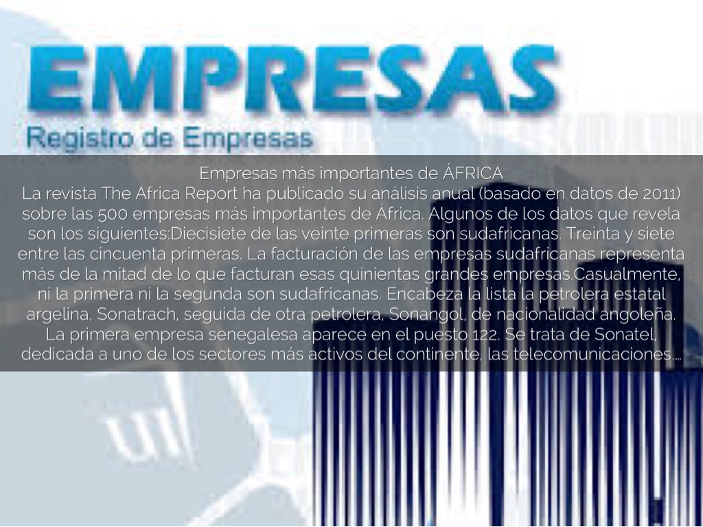 La revista The Africa Report ha publicado su análisis anual (basado en datos de 2011) sobre las 500 empresas más importantes de África. Algunos de los datos que revela son los siguientes:Diecisiete de las veinte primeras son sudafricanas. Treinta y siete entre las cincuenta primeras. La facturación de las empresas sudafricanas representa más de la mitad de lo que facturan esas quinientas grandes empresas.Casualmente, ni la primera ni la segunda son sudafricanas. Encabeza la lista la petrolera estatal argelina, Sonatrach, seguida de otra petrolera, Sonangol, de nacionalidad angoleña.