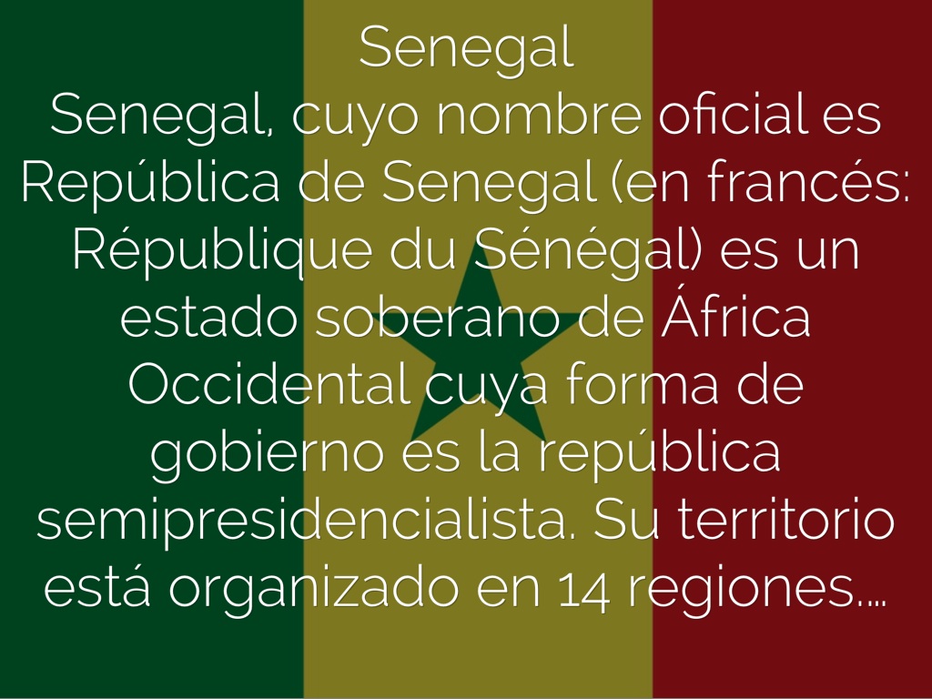 Senegal, cuyo nombre oficial es República de Senegal (en francés: République du Sénégal) es un estado soberano de África Occidental cuya forma de gobierno es la república semipresidencialista. Su territorio está organizado en 14 regiones.