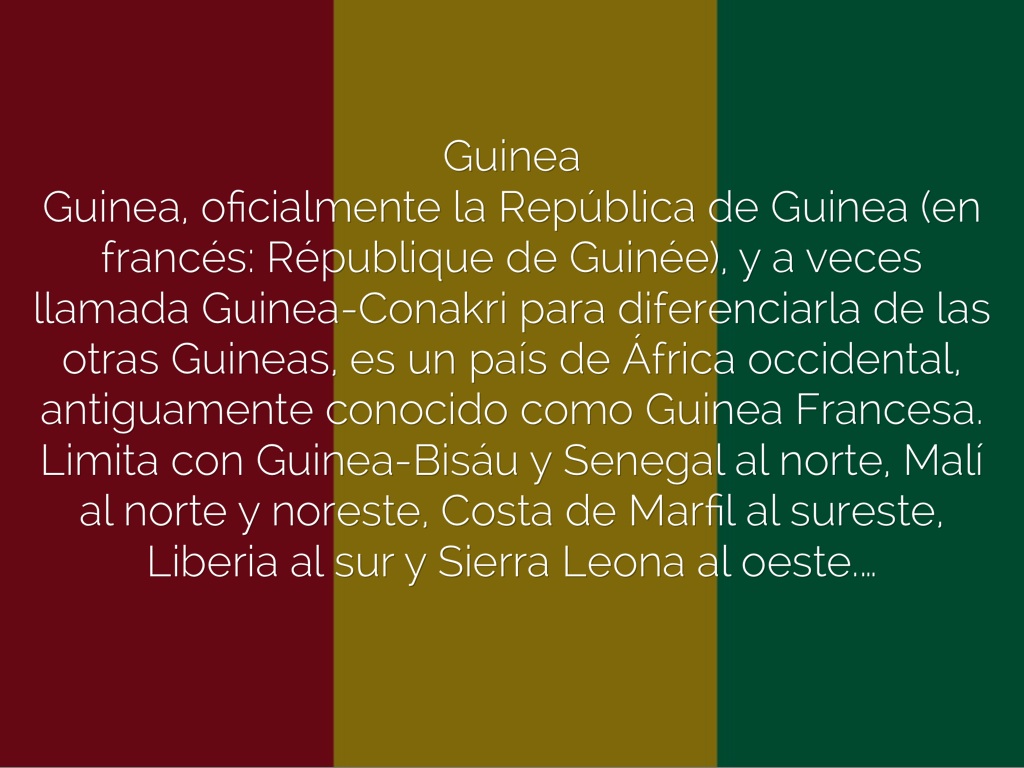 Guinea, oficialmente la República de Guinea (en francés: République de Guinée), y a veces llamada Guinea-Conakri para diferenciarla de las otras Guineas, es un país de África occidental, antiguamente conocido como Guinea Francesa. Limita con Guinea-Bisáu y Senegal al norte, Malí al norte y noreste, Costa de Marfil al sureste, Liberia al sur y Sierra Leona al oeste.