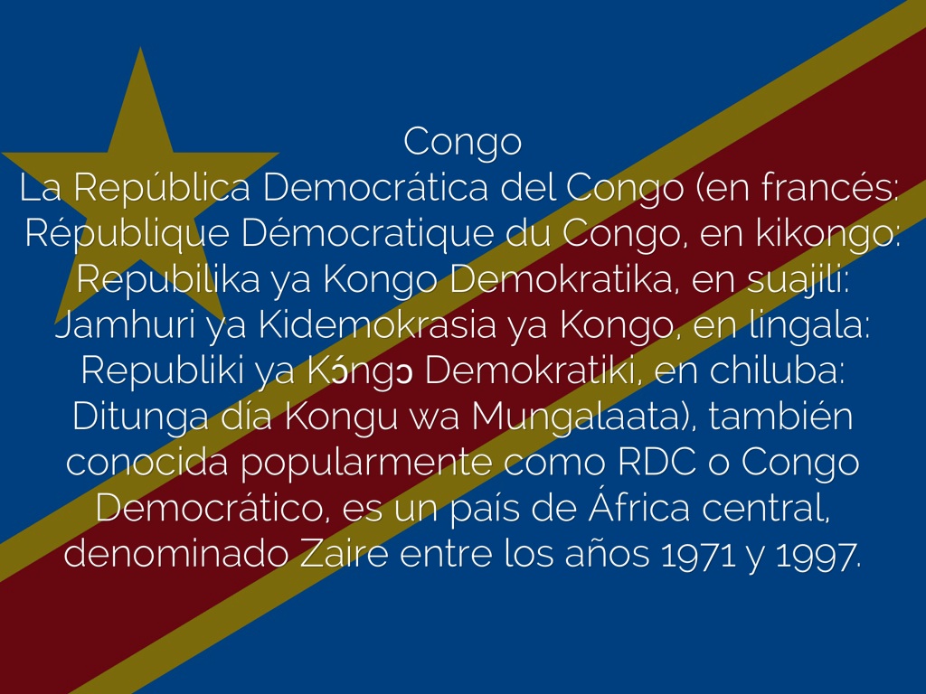 La República Democrática del Congo (en francés: République Démocratique du Congo, en kikongo: Repubilika ya Kongo Demokratika, en suajili: Jamhuri ya Kidemokrasia ya Kongo, en lingala: Republiki ya Kɔ́ngɔ Demokratiki, en chiluba: Ditunga día Kongu wa Mungalaata), también conocida popularmente como RDC o Congo Democrático, es un país de África central, denominado Zaire entre los años 1971 y 1997.