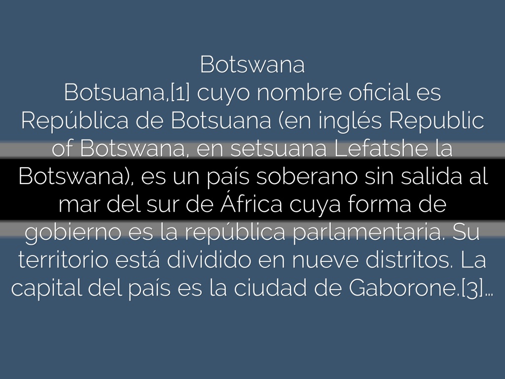 Botsuana,[1] cuyo nombre oficial es República de Botsuana (en inglés Republic of Botswana, en setsuana Lefatshe la Botswana), es un país soberano sin salida al mar del sur de África cuya forma de gobierno es la república parlamentaria. Su territorio está dividido en nueve distritos. La capital del país es la ciudad de Gaborone.[3]