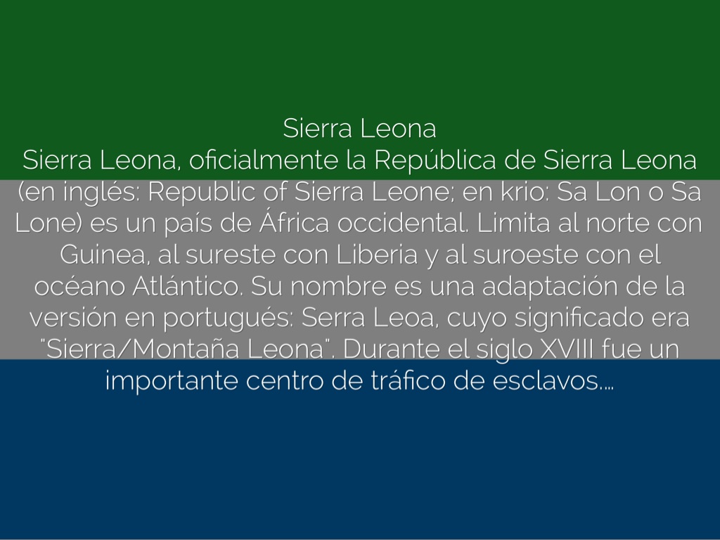 Sierra Leona, oficialmente la República de Sierra Leona (en inglés: Republic of Sierra Leone; en krio: Sa Lon o Sa Lone) es un país de África occidental. Limita al norte con Guinea, al sureste con Liberia y al suroeste con el océano Atlántico. Su nombre es una adaptación de la versión en portugués: Serra Leoa, cuyo significado era "Sierra/Montaña Leona". Durante el siglo XVIII fue un importante centro de tráfico de esclavos.