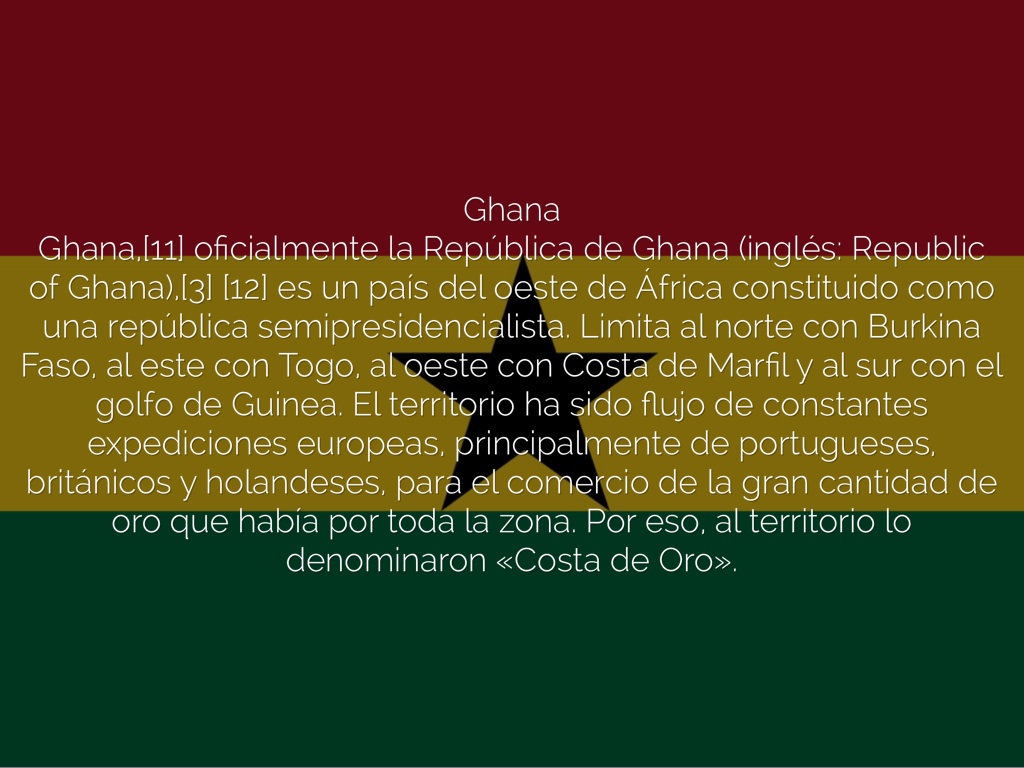 Ghana,[11] oficialmente la República de Ghana (inglés: Republic of Ghana),[3] [12] es un país del oeste de África constituido como una república semipresidencialista. Limita al norte con Burkina Faso, al este con Togo, al oeste con Costa de Marfil y al sur con el golfo de Guinea. El territorio ha sido flujo de constantes expediciones europeas, principalmente de portugueses, británicos y holandeses, para el comercio de la gran cantidad de oro que había por toda la zona. Por eso, al territorio lo denominaron «Costa de Oro».