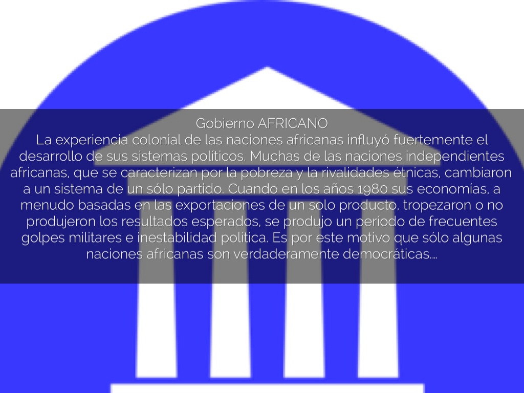 La experiencia colonial de las naciones africanas influyó fuertemente el desarrollo de sus sistemas políticos. Muchas de las naciones independientes africanas, que se caracterizan por la pobreza y la rivalidades étnicas, cambiaron a un sistema de un sólo partido. Cuando en los años 1980 sus economías, a menudo basadas en las exportaciones de un solo producto, tropezaron o no produjeron los resultados esperados, se produjo un período de frecuentes golpes militares e inestabilidad política. Es por este motivo que sólo algunas naciones africanas son verdaderamente democráticas.