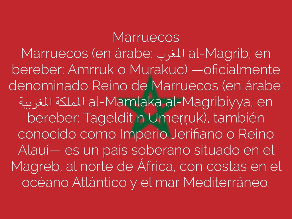 Marruecos (en árabe: المغرب al-Magrib; en bereber: Amrruk o Murakuc) —oficialmente denominado Reino de Marruecos (en árabe: المملكة المغربية al-Mamlaka al-Magribiyya; en bereber: Tageldit n Umeṛṛuk), también conocido como Imperio Jerifiano o Reino Alauí— es un país soberano situado en el Magreb, al norte de África, con costas en el océano Atlántico y el mar Mediterráneo.