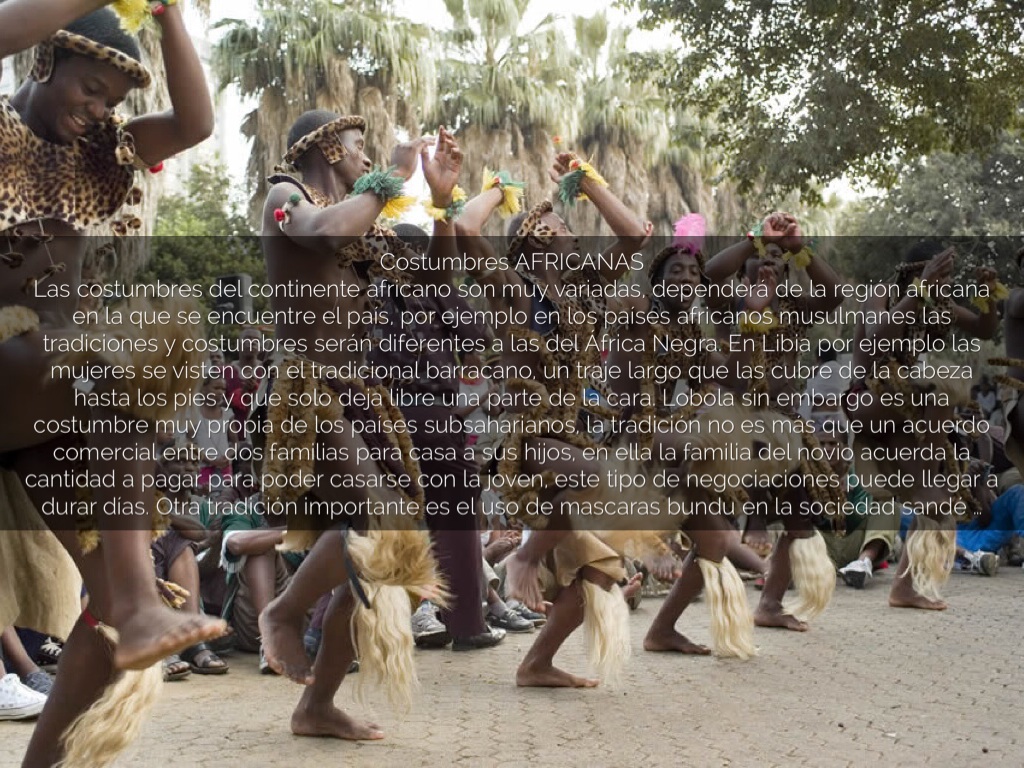 Las costumbres del continente africano son muy variadas, dependerá de la región africana en la que se encuentre el país, por ejemplo en los países africanos musulmanes las tradiciones y costumbres serán diferentes a las del África Negra. En Libia por ejemplo las mujeres se visten con el tradicional barracano, un traje largo que las cubre de la cabeza hasta los pies y que solo deja libre una parte de la cara. Lobola sin embargo es una costumbre muy propia de los países subsaharianos, la tradición no es más que un acuerdo comercial entre dos familias para casa a sus hijos, en ella la familia del novio acuerda la cantidad a pagar para poder casarse con la joven, este tipo de negociaciones puede llegar a durar días. Otra tradición importante es el uso de mascaras bundu en la sociedad sandé de Sierra Leona, la cual consta en utilizar mascaras de madera pulida, para representar lo más puro de la belleza femenina.