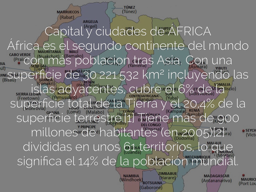 África es el segundo continente del mundo con más poblacion tras Asia. Con una superficie de 30.221.532 km² incluyendo las islas adyacentes, cubre el 6% de la superficie total de la Tierra y el 20,4% de la superficie terrestre.[1] Tiene más de 900 millones de habitantes (en 2005)[2] divididas en unos 61 territorios, lo que significa el 14% de la población mundial.