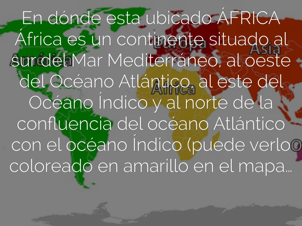 África es un continente situado al sur del Mar Mediterráneo, al oeste del Océano Atlántico, al este del Océano Índico y al norte de la confluencia del océano Atlántico con el océano Índico (puede verlo coloreado en amarillo en el mapa).