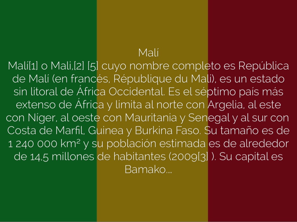 Malí[1] o Mali,[2] [5] cuyo nombre completo es República de Malí (en francés, République du Mali), es un estado sin litoral de África Occidental. Es el séptimo país más extenso de África y limita al norte con Argelia, al este con Níger, al oeste con Mauritania y Senegal y al sur con Costa de Marfil, Guinea y Burkina Faso. Su tamaño es de 1 240 000 km² y su población estimada es de alrededor de 14,5 millones de habitantes (2009[3] ). Su capital es Bamako.