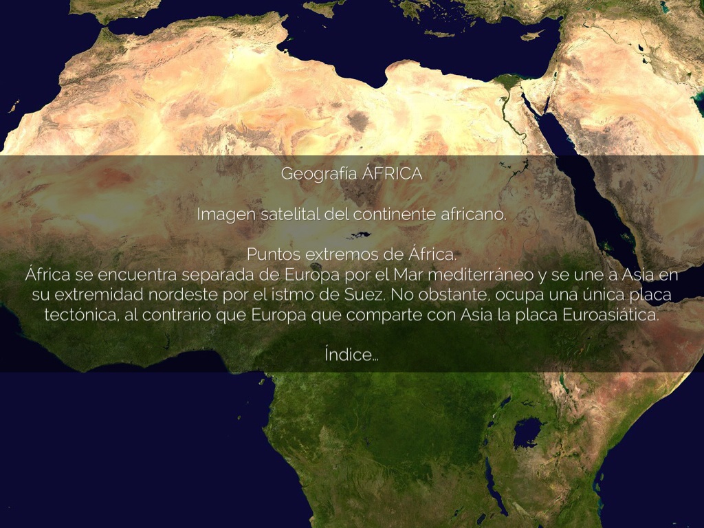 África es el tercer continente (después de Asia y América) más grande del mundo por extensión territorial. Limita al norte con el mar Mediterráneo, al oeste con el océano Atlántico, al sur con la conjunción de los océanos Atlántico e Índico y al este con el mar Rojo y el océano Índico. Aunque posee una superficie total de 30.272.922 km² (621.600 en masa insular), la cual representa el 20.4% del total terrestre, la población es de mil millones de habitantes, menos del 15%. El continente se organiza en 54 países, siendo todos ellos, miembros de la Unión Africana, con excepción de Marruecos.