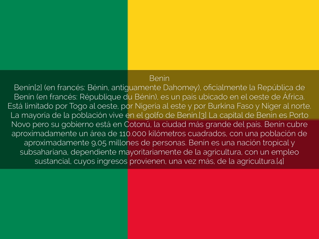 Benín[2] (en francés: Bénin, antiguamente Dahomey), oficialmente la República de Benín (en francés: République du Bénin), es un país ubicado en el oeste de África. Está limitado por Togo al oeste, por Nigeria al este y por Burkina Faso y Níger al norte. La mayoría de la población vive en el golfo de Benín.[3] La capital de Benín es Porto Novo pero su gobierno está en Cotonú, la ciudad más grande del país. Benín cubre aproximadamente un área de 110.000 kilómetros cuadrados, con una población de aproximadamente 9,05 millones de personas. Benín es una nación tropical y subsahariana, dependiente mayoritariamente de la agricultura, con un empleo sustancial, cuyos ingresos provienen, una vez más, de la agricultura.[4]