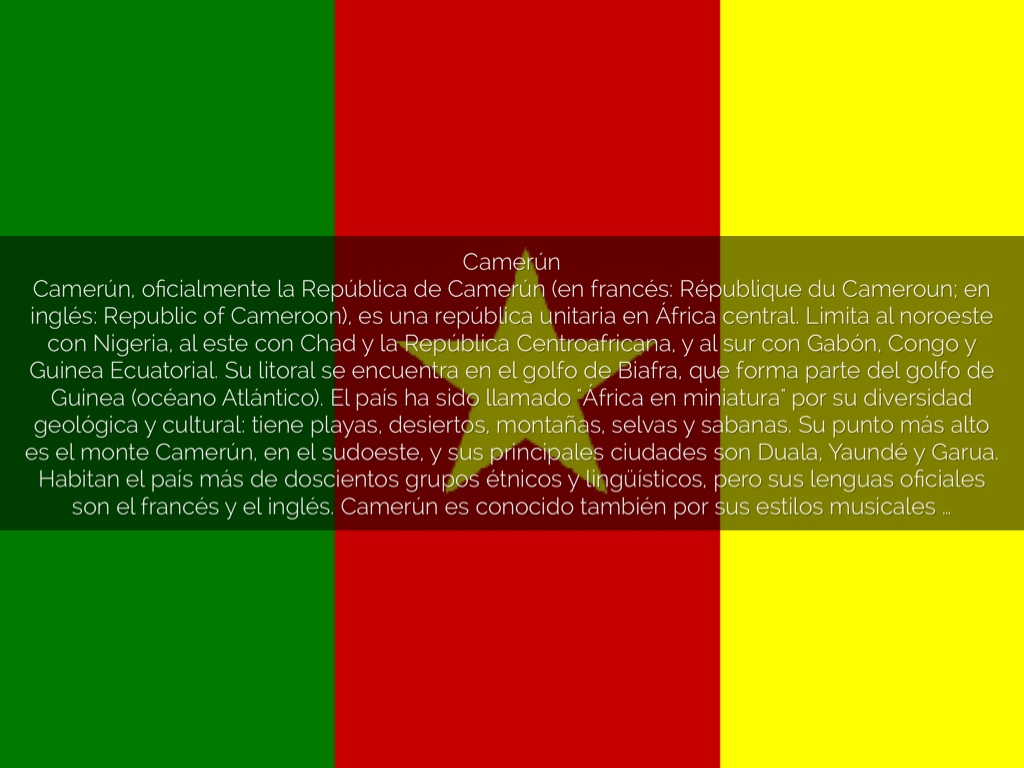 Camerún, oficialmente la República de Camerún (en francés: République du Cameroun; en inglés: Republic of Cameroon), es una república unitaria en África central. Limita al noroeste con Nigeria, al este con Chad y la República Centroafricana, y al sur con Gabón, Congo y Guinea Ecuatorial. Su litoral se encuentra en el golfo de Biafra, que forma parte del golfo de Guinea (océano Atlántico). El país ha sido llamado "África en miniatura" por su diversidad geológica y cultural: tiene playas, desiertos, montañas, selvas y sabanas. Su punto más alto es el monte Camerún, en el sudoeste, y sus principales ciudades son Duala, Yaundé y Garua. Habitan el país más de doscientos grupos étnicos y lingüísticos, pero sus lenguas oficiales son el francés y el inglés. Camerún es conocido también por sus estilos musicales autóctonos, especialmente el makossa y el bikutsi, así como por los éxitos de su selección nacional de fútbol.
