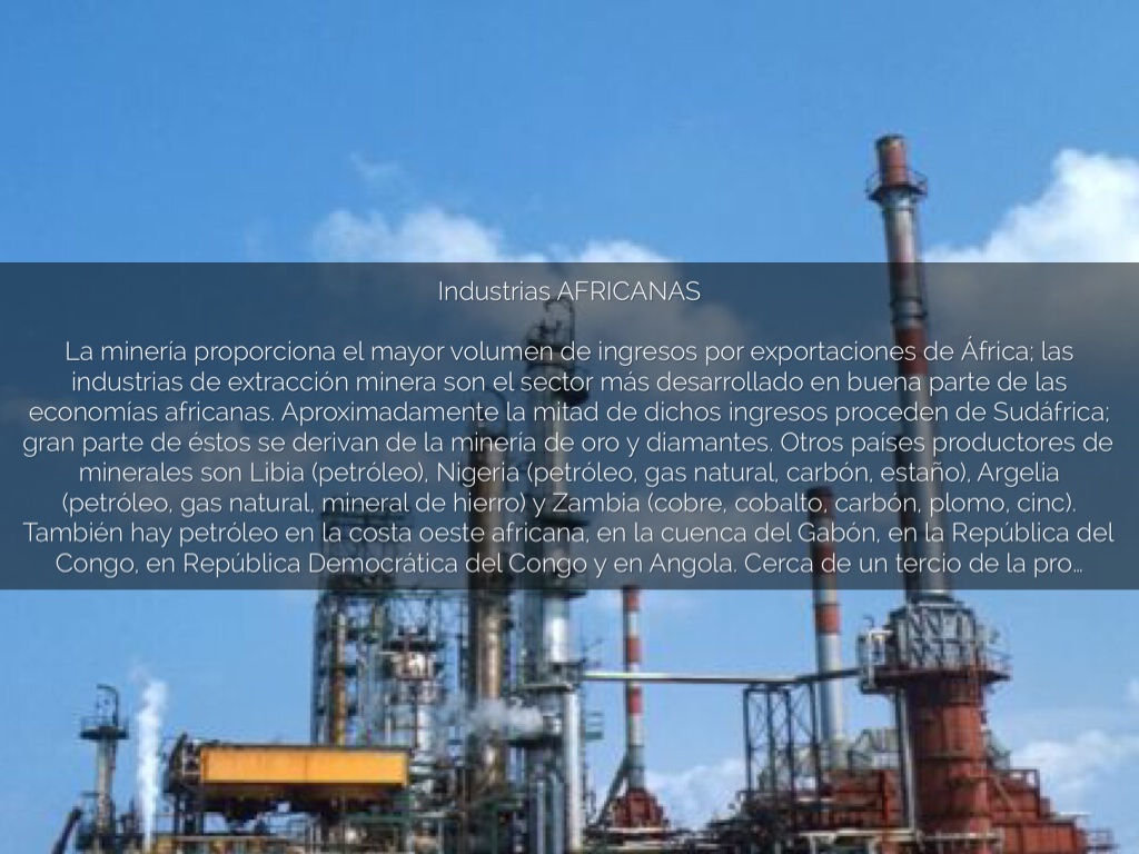La minería proporciona el mayor volumen de ingresos por exportaciones de África; las industrias de extracción minera son el sector más desarrollado en buena parte de las economías africanas. Aproximadamente la mitad de dichos ingresos proceden de Sudáfrica; gran parte de éstos se derivan de la minería de oro y diamantes. Otros países productores de minerales son Libia (petróleo), Nigeria (petróleo, gas natural, carbón, estaño), Argelia (petróleo, gas natural, mineral de hierro) y Zambia (cobre, cobalto, carbón, plomo, cinc). También hay petróleo en la costa oeste africana, en la cuenca del Gabón, en la República del Congo, en República Democrática del Congo y en Angola. Cerca de un tercio de la producción de uranio mundial se extrae de África, sobre todo en Sudáfrica, Níger, República Democrática del Congo, la República Centroafricana y Gabón. La reserva de radio más grande del mundo se encuentra en República Democrática del Congo. El 20% de las reservas mundiales de cobre se concentra en Zambia, República Democrática del Congo, Sudáfrica y Zimbabue.
