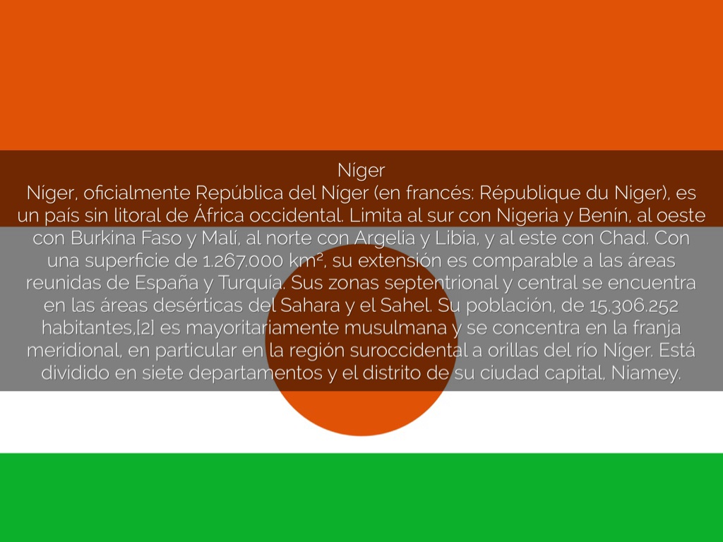 Níger, oficialmente República del Níger (en francés: République du Niger), es un país sin litoral de África occidental. Limita al sur con Nigeria y Benín, al oeste con Burkina Faso y Malí, al norte con Argelia y Libia, y al este con Chad. Con una superficie de 1.267.000 km², su extensión es comparable a las áreas reunidas de España y Turquía. Sus zonas septentrional y central se encuentra en las áreas desérticas del Sahara y el Sahel. Su población, de 15.306.252 habitantes,[2] es mayoritariamente musulmana y se concentra en la franja meridional, en particular en la región suroccidental a orillas del río Níger. Está dividido en siete departamentos y el distrito de su ciudad capital, Niamey.