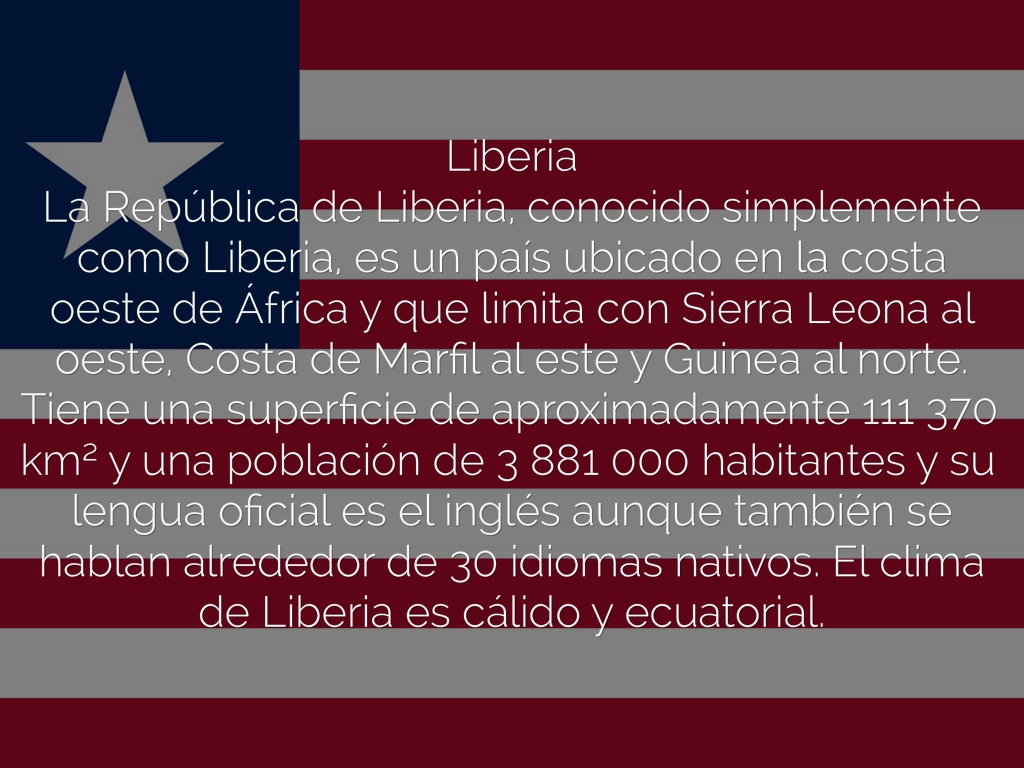 La República de Liberia, conocido simplemente como Liberia, es un país ubicado en la costa oeste de África y que limita con Sierra Leona al oeste, Costa de Marfil al este y Guinea al norte. Tiene una superficie de aproximadamente 111 370 km² y una población de 3 881 000 habitantes y su lengua oficial es el inglés aunque también se hablan alrededor de 30 idiomas nativos. El clima de Liberia es cálido y ecuatorial.