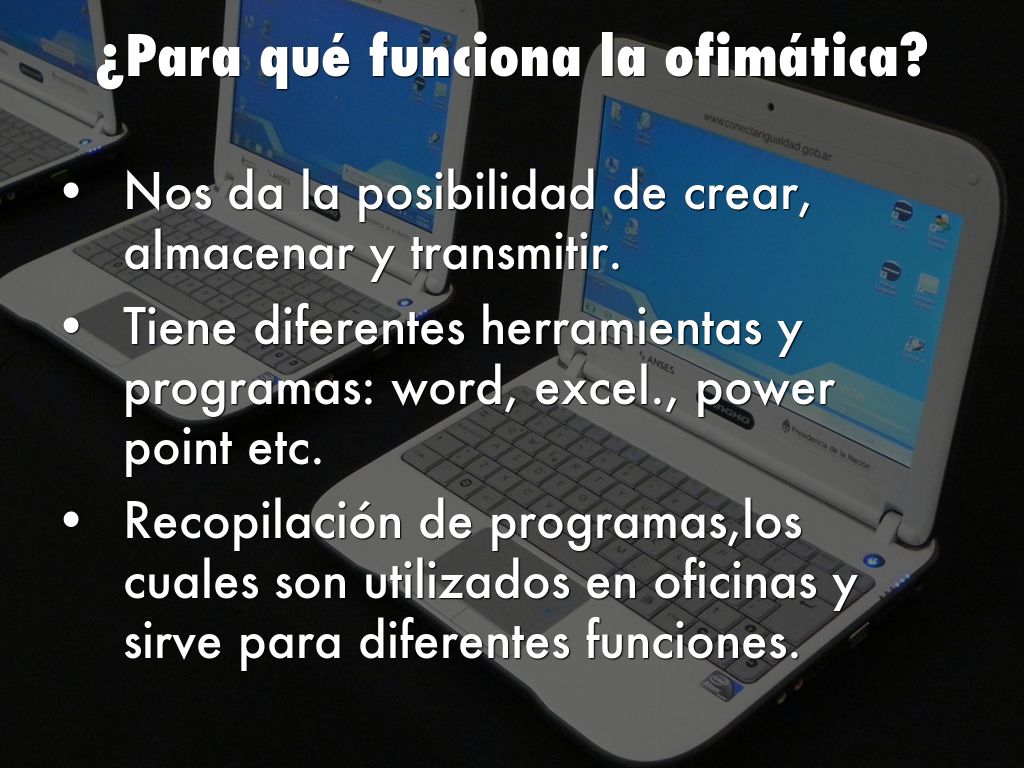 Designa al conjunto de técnicas, aplicaciones y herramientas informáticas que se utilizan en funciones de oficina para optimizar, automatizar, y mejorar tareas y procedimientos relacionados. Las herramientas ofimáticas permiten idear, crear, manipular, transmitir o almacenar la información necesaria en una oficina.