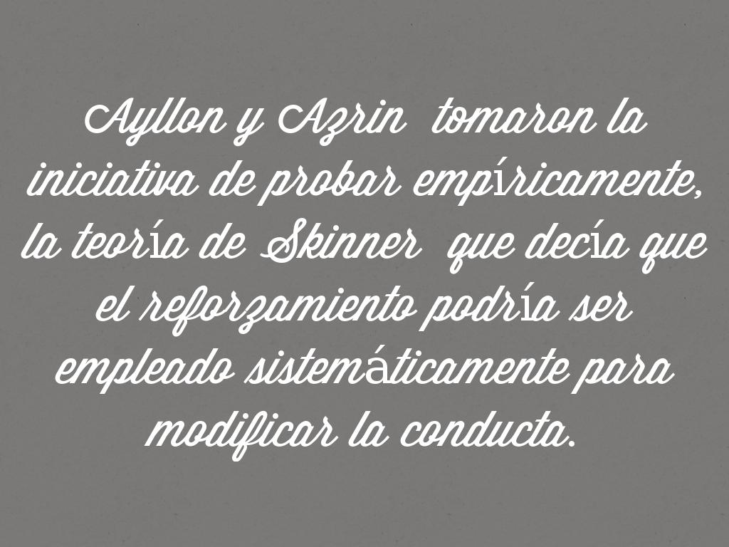 Ayllon y Azrin tomaron la iniciativa de probar empíricamente, la teoría de Skinner que decía que el reforzamiento podría ser empleado sistemáticamente para modificar la conducta.