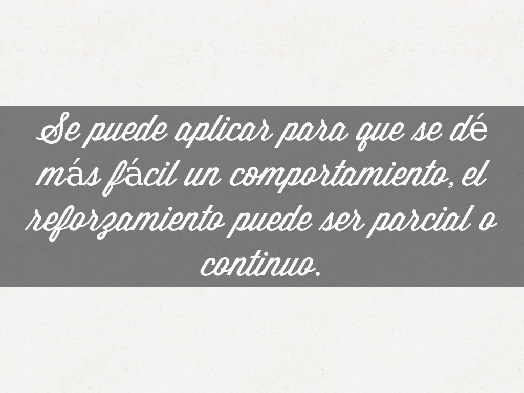 Se puede aplicar para que se dé más fácil un comportamiento, el reforzamiento puede ser parcial o continuo.