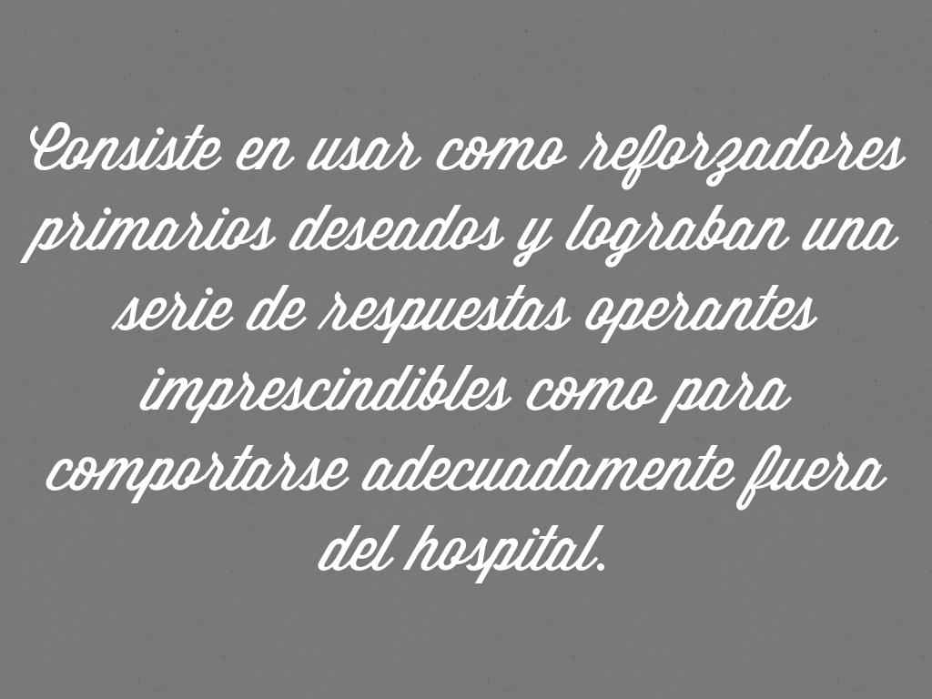 Consiste en usar como reforzadores primarios deseados y lograban una serie de respuestas operantes imprescindibles como para comportarse adecuadamente fuera del hospital.