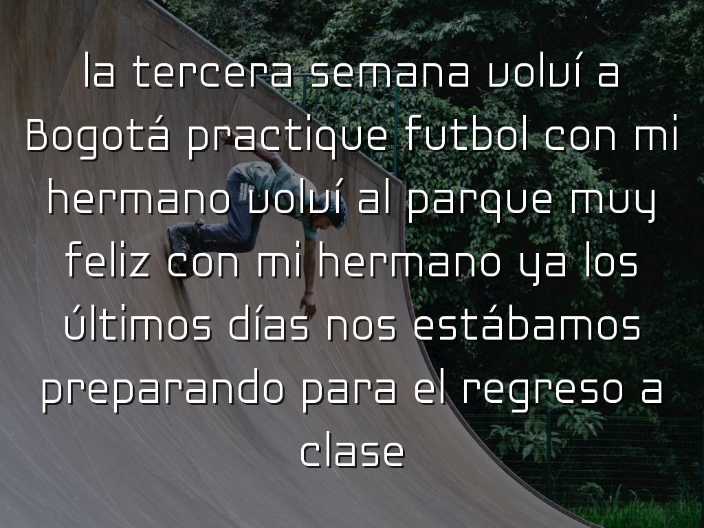 la tercera semana volví a Bogotá practique futbol con mi hermano volví al parque muy feliz con mi hermano ya los últimos días nos estábamos preparando para el regreso a clase