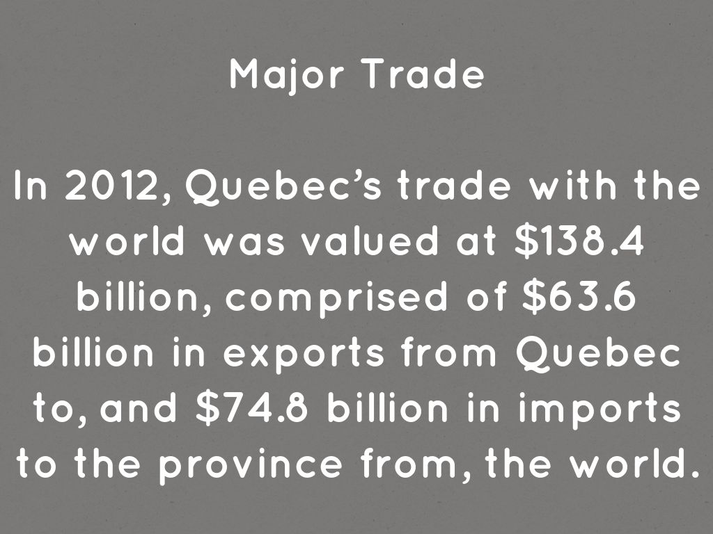 In 2012, Quebec’s trade with the world was valued at $138.4 billion, comprised of $63.6 billion in exports from Quebec to, and $74.8 billion in imports to the province from, the world.