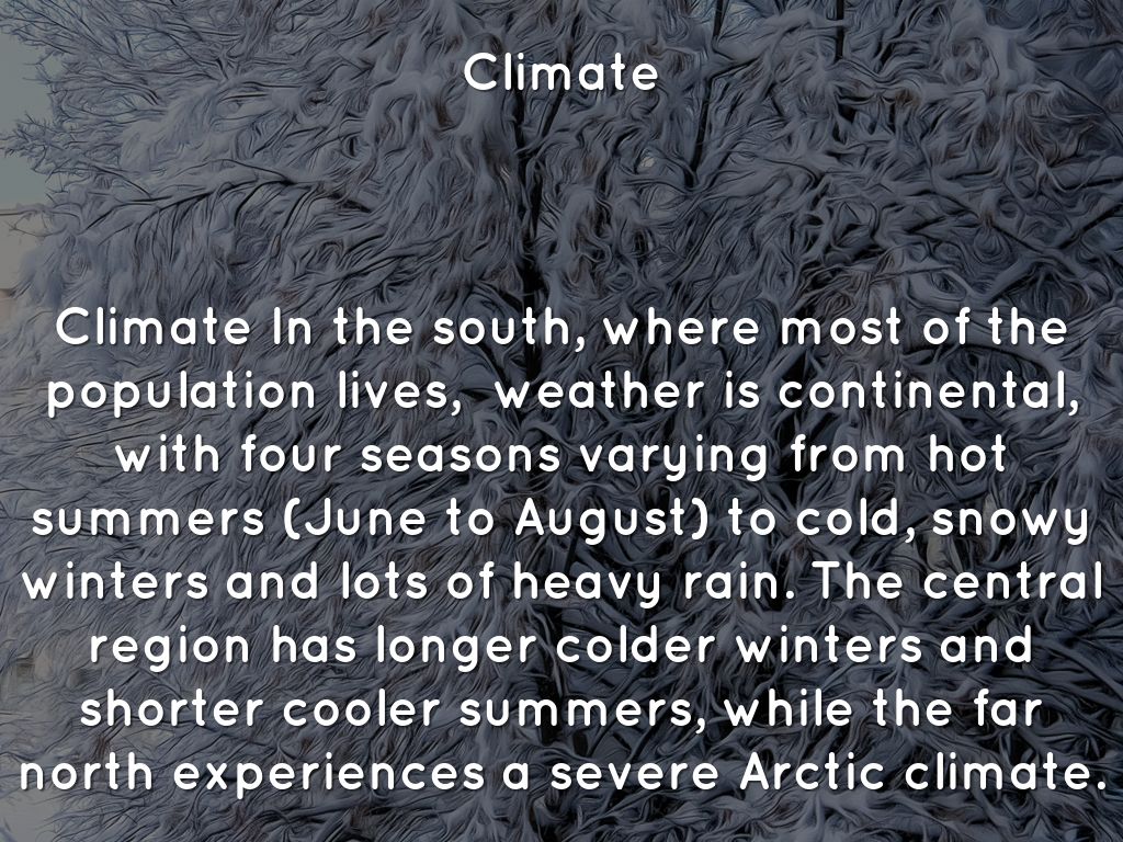 Climate In the south, where most of the population lives, weather is continental, with four seasons varying from hot summers (June to August) to cold, snowy winters and lots of heavy rain. The central region has longer colder winters and shorter cooler summers, while the far north experiences a severe Arctic climate.