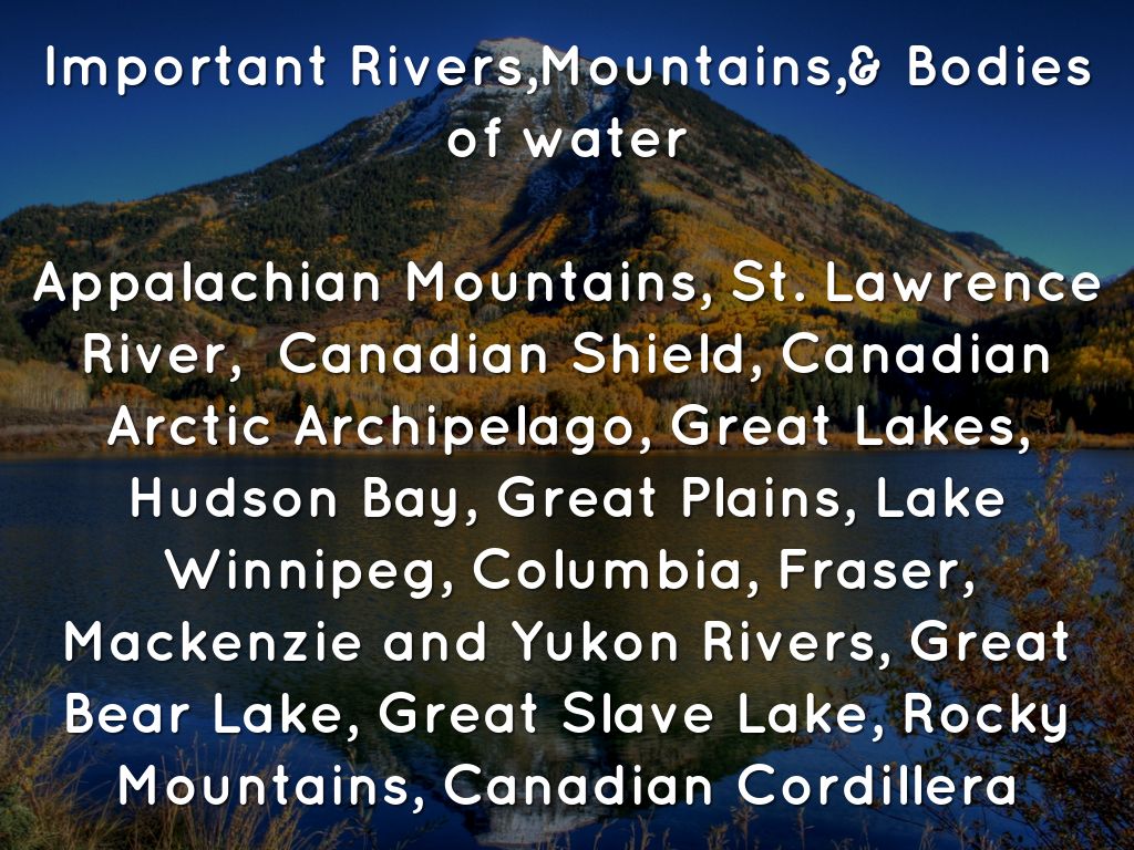 Appalachian Mountains, St. Lawrence River, Canadian Shield, Canadian Arctic Archipelago, Great Lakes, Hudson Bay, Great Plains, Lake Winnipeg, Columbia, Fraser, Mackenzie and Yukon Rivers, Great Bear Lake, Great Slave Lake, Rocky Mountains, Canadian Cordillera