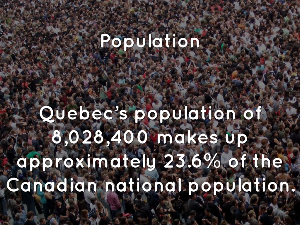 Quebec’s population of 8,028,400 makes up approximately 23.6% of the Canadian national population.