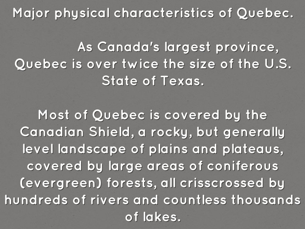 Major physical characteristics of Quebec. As Canada's largest province, Quebec is over twice the size of the U.S. State of Texas.