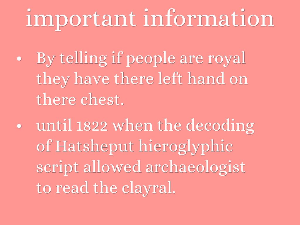 until 1822 when the decoding of Hatsheput hieroglyphic script allowed archaeologist to read the clayral.