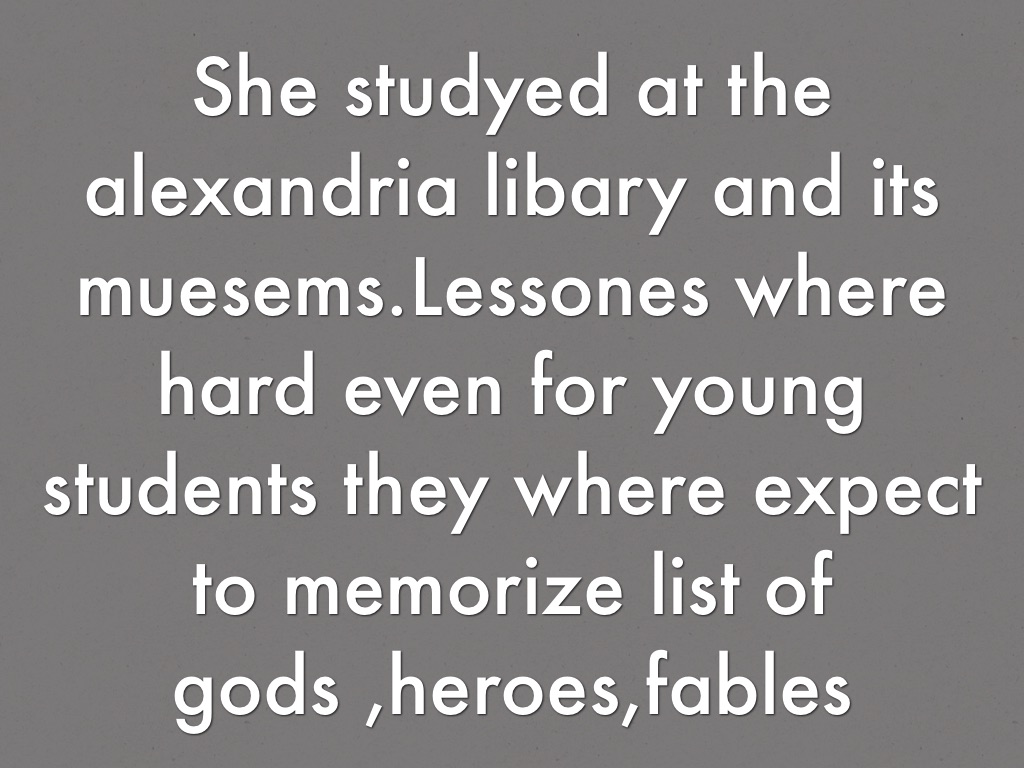 She studyed at the alexandria libary and its muesems.Lessones where hard even for young students they where expect to memorize list of gods ,heroes,fables
