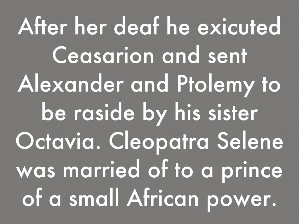 After her deaf he exicuted Ceasarion and sent Alexander and Ptolemy to be raside by his sister Octavia. Cleopatra Selene was married of to a prince of a small African power.