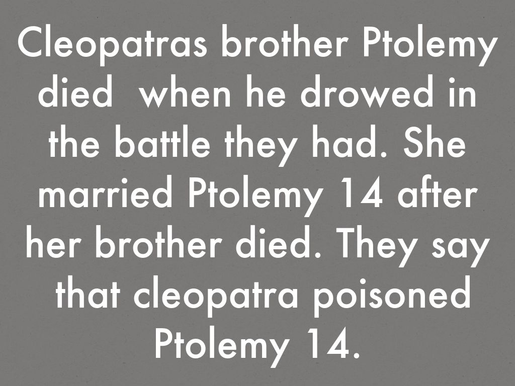Cleopatras brother Ptolemy died when he drowed in the battle they had. She married Ptolemy 14 after her brother died. They say that cleopatra poisoned Ptolemy 14.