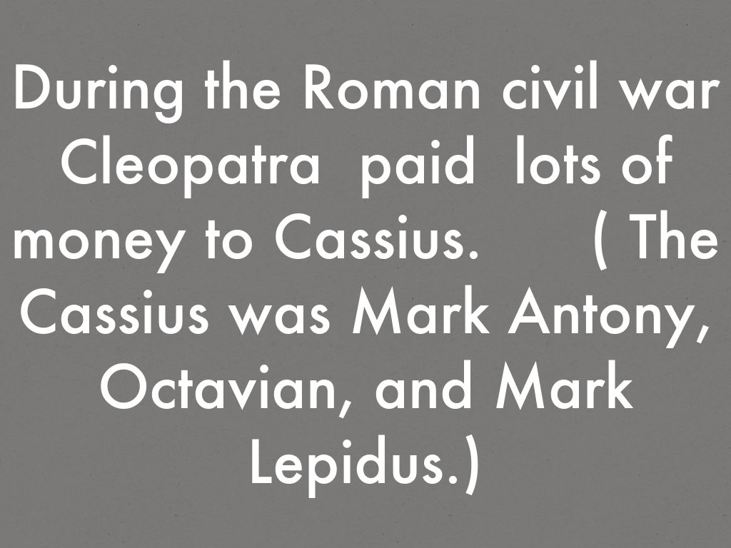 During the Roman civil war Cleopatra paid lots of money to Cassius. ( The Cassius was Mark Antony, Octavian, and Mark Lepidus.)