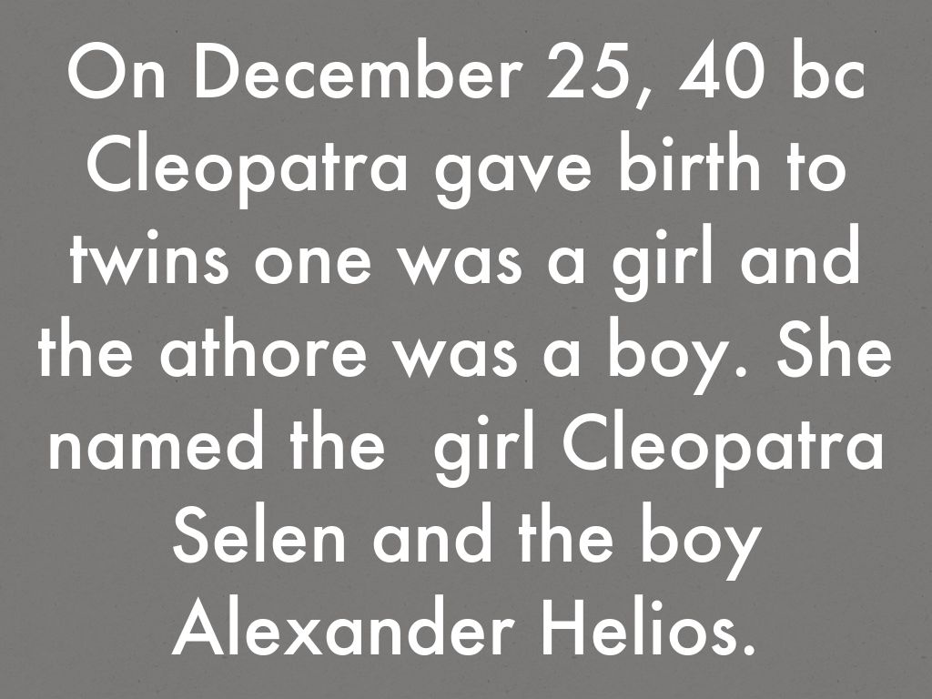 On December 25, 40 bc Cleopatra gave birth to twins one was a girl and the athore was a boy. She named the girl Cleopatra Selen and the boy Alexander Helios.