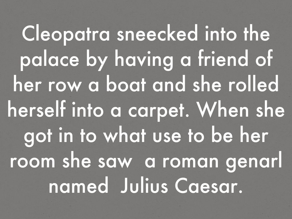 Cleopatra sneecked into the palace by having a friend of her row a boat and she rolled herself into a carpet. When she got in to what use to be her room she saw a roman genarl named Julius Caesar.
